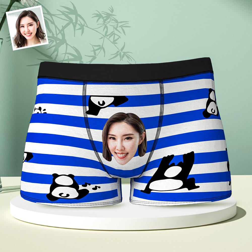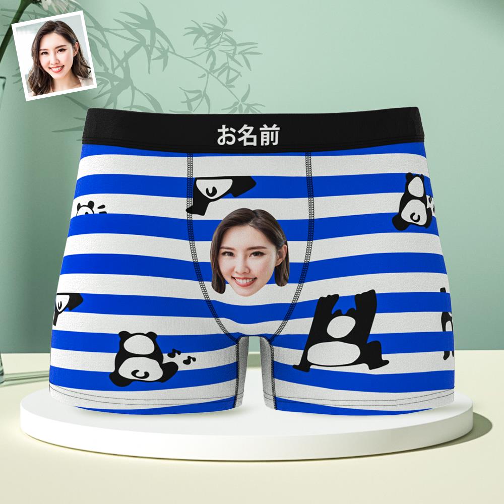 カスタムフォトボクサーパンツ-写真とテキスト入れ可能な青い縞柄のよじ登るパンダ下着彼氏や旦那へのギフト