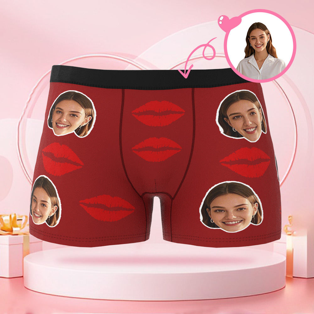 カスタム写真入り下着、赤い唇の模様がプリントされた、カップルへのユニークでセクシーなギフト。写真入りのパーソナライズされたバレンタインデー用下着。