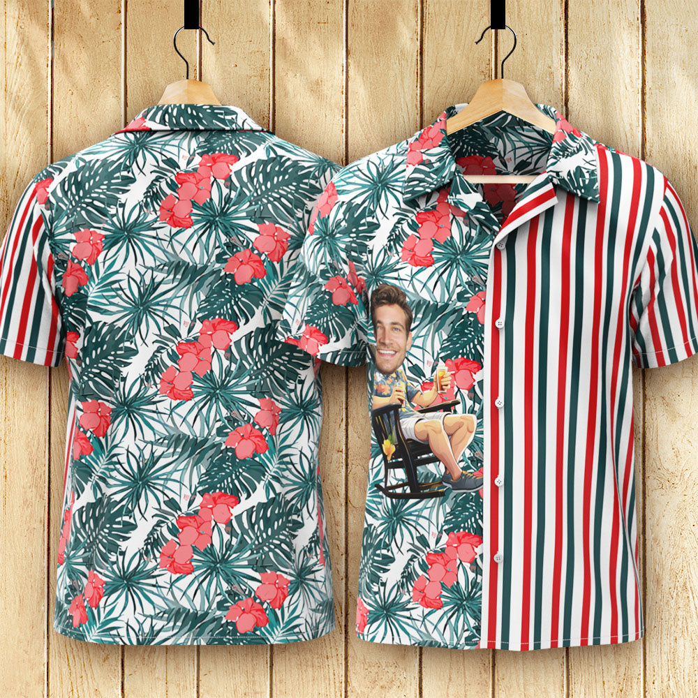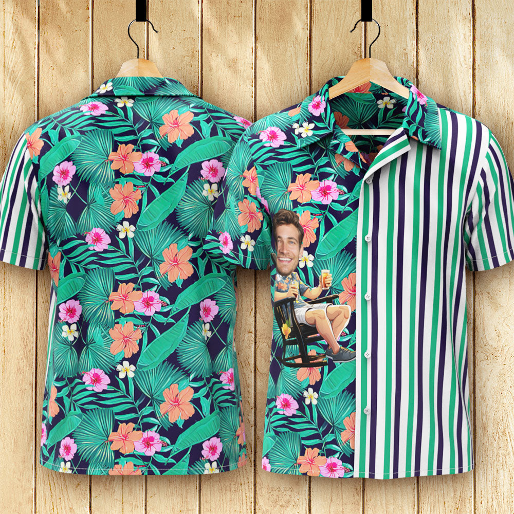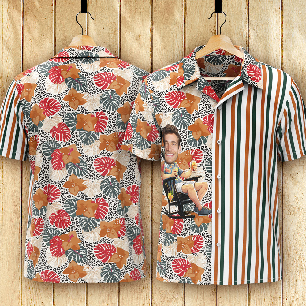 カスタムフォトアロハシャツ-写真入り可能なオリジナル縦縞アロハシャツ-緑の葉と花