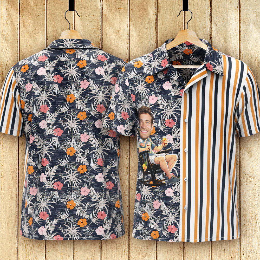 カスタムフォトアロハシャツ-写真入り可能なオリジナル縦縞アロハシャツ-ロマンチックなハワイの花