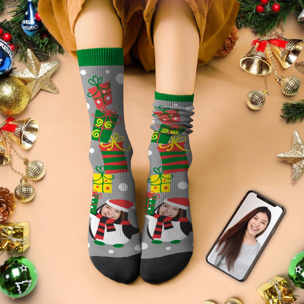 カスタムフェイスソックス-写真入り可能なオリジナルクリスマス靴下-可愛いペンギン柄