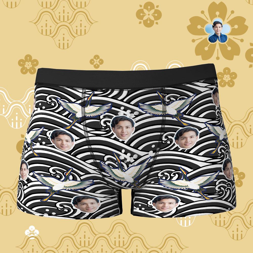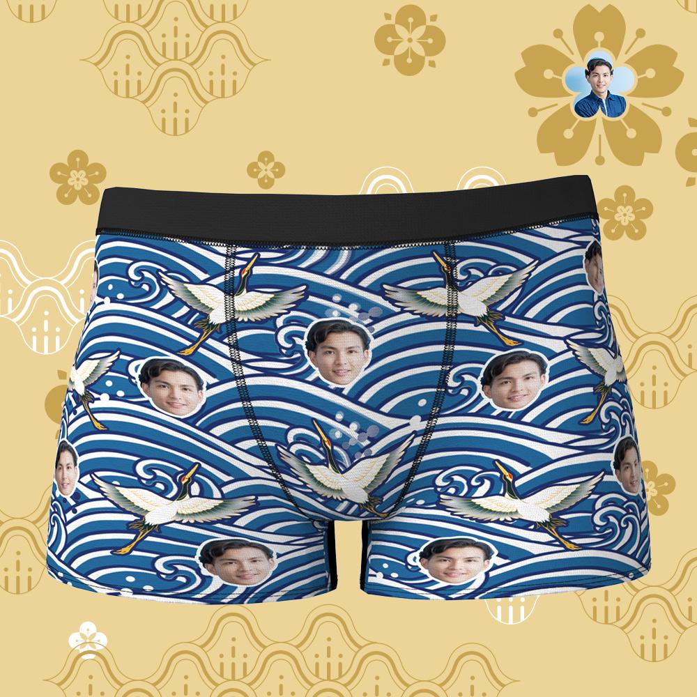 カスタムフォトボクサーパンツ-写真入り可能な鹤と波柄下着父さんや彼氏への新年のプレゼント
