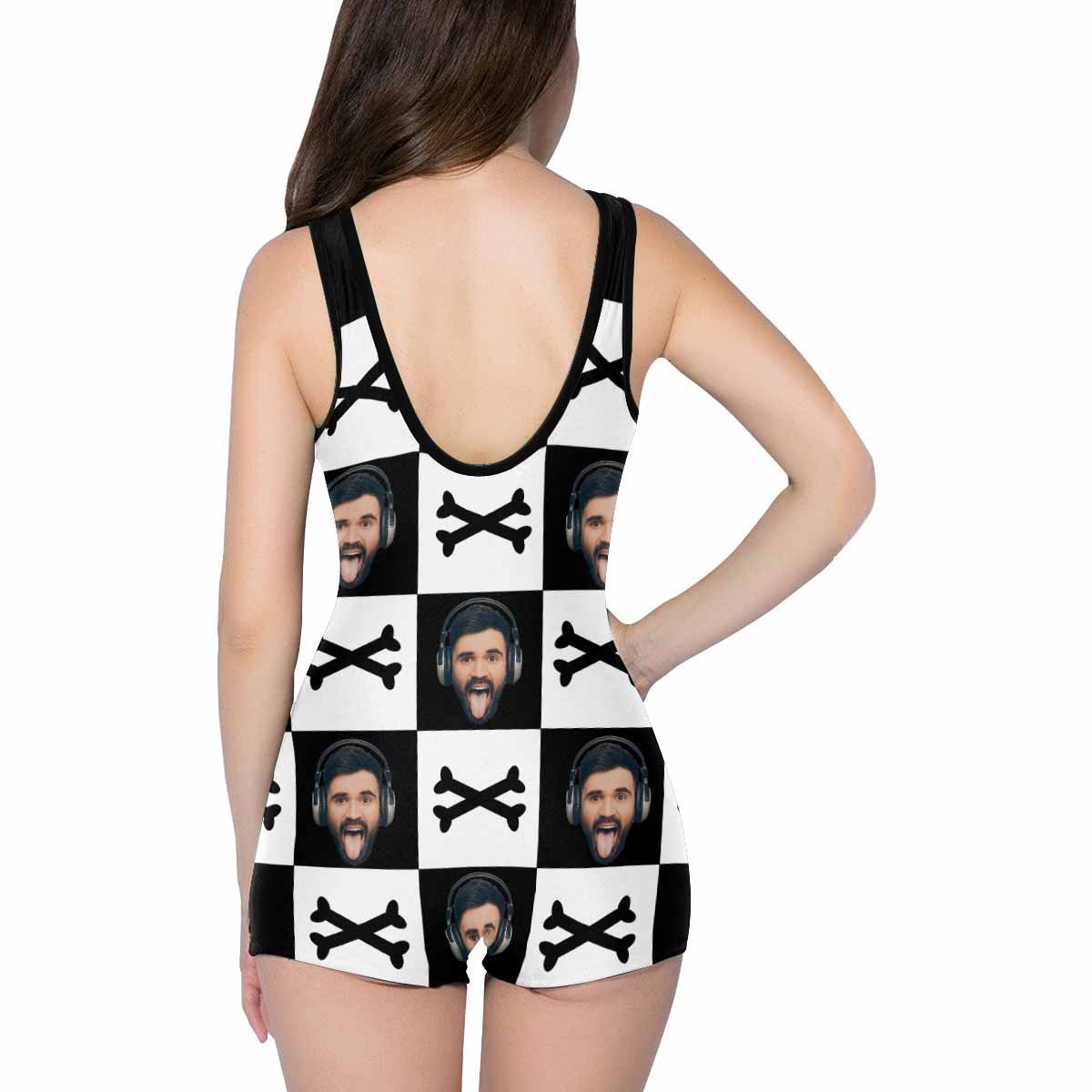 カスタムフェイス骨柄のブラックとホワイト女性用ワンピース水着-写真入れ可能な水着