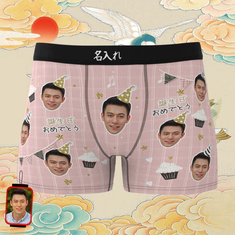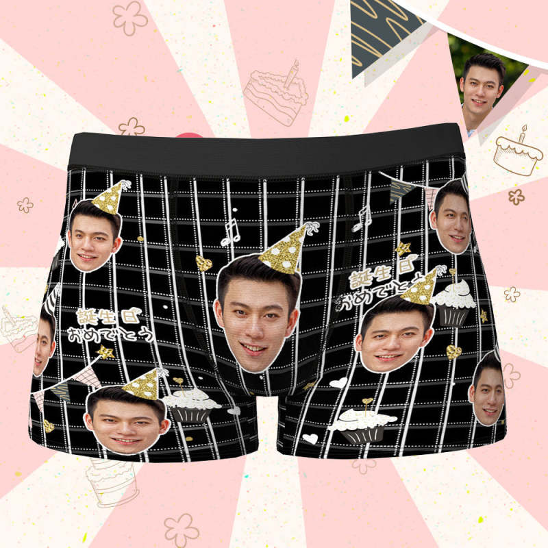 カスタムフォトボクサーパンツ-写真とテキスト入れ可能な誕生日下着ケーキ柄誕生日おめでとうギフト