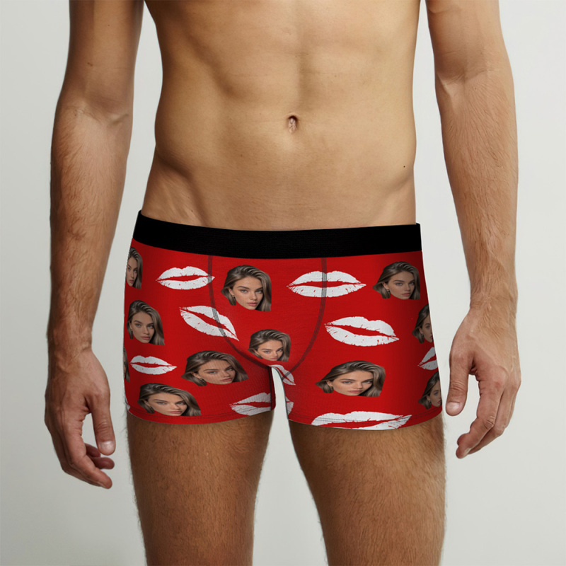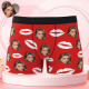 カスタム写真入り下着、赤い唇の模様がプリントされた、カップルへのユニークでセクシーなギフト。写真入りのパーソナライズされたバレンタインデー用下着。