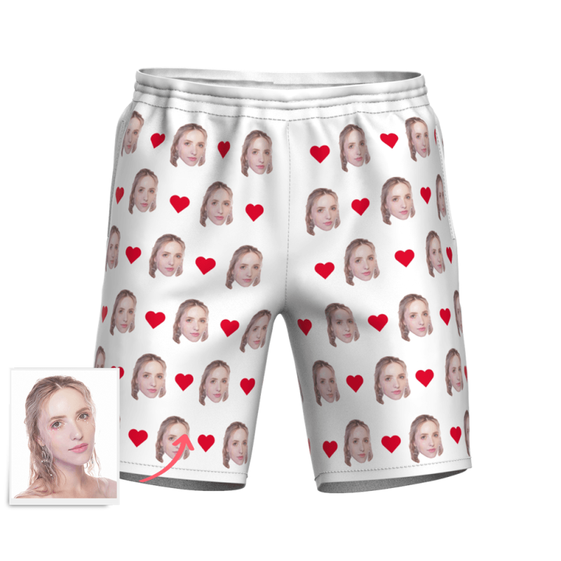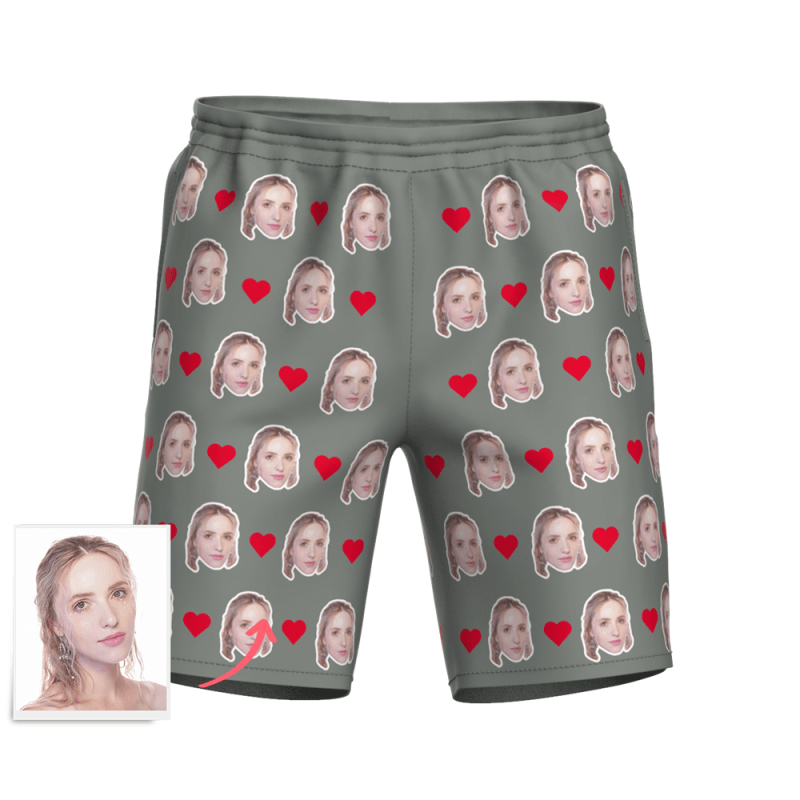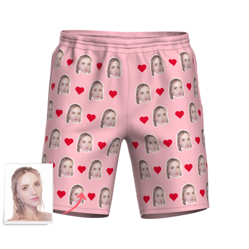 記念日プレゼント-メンズカスタムフォトサーフパンツ-写真入り可能なオリジナル水着最高の贈り物メンズ水着フォトマッシュハートマーク付き