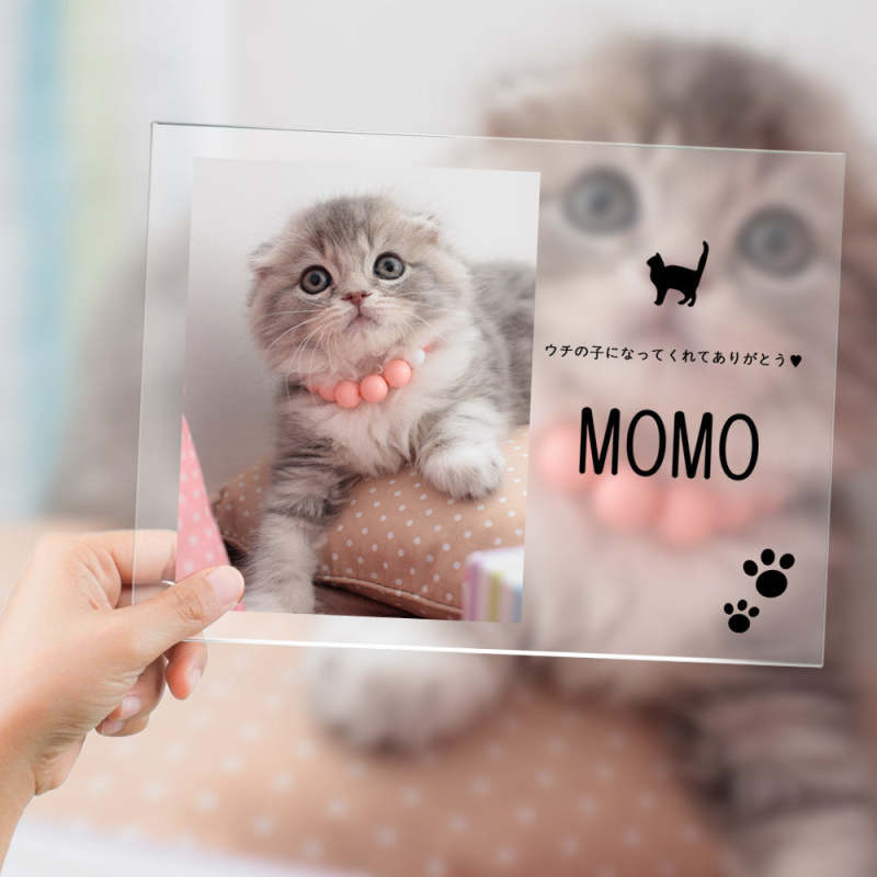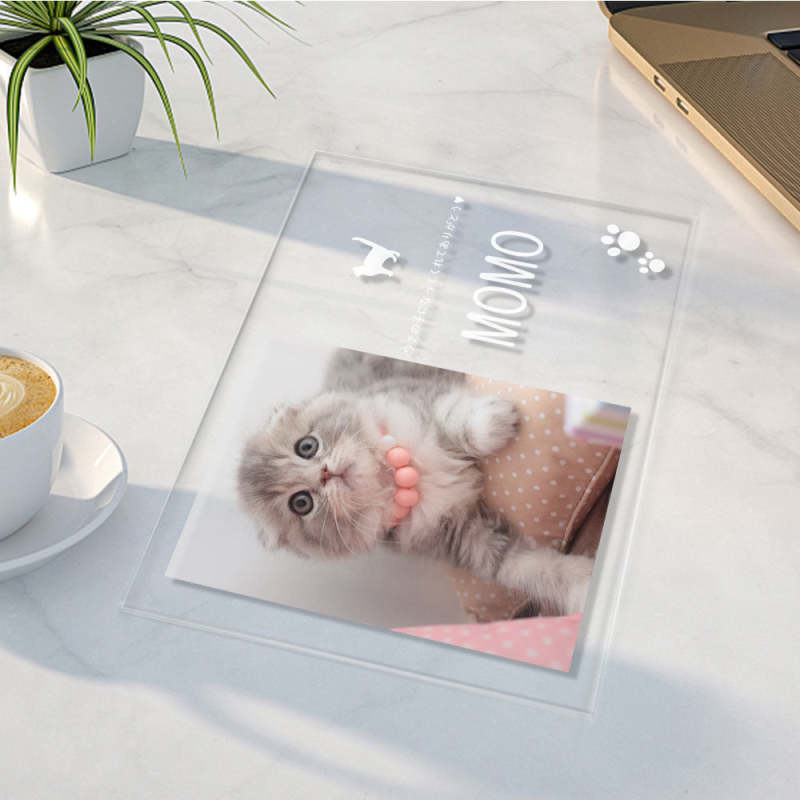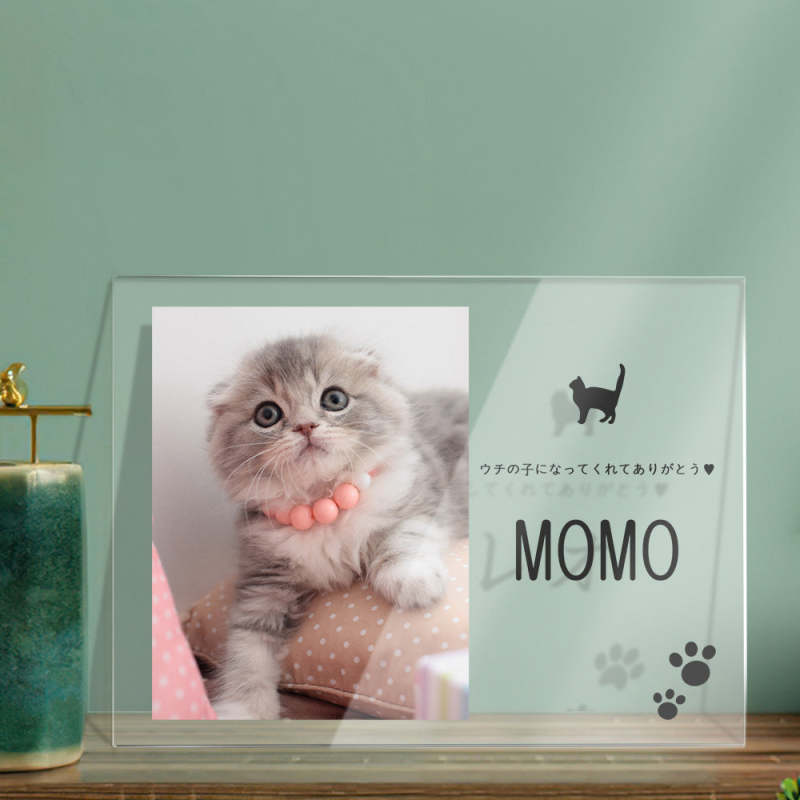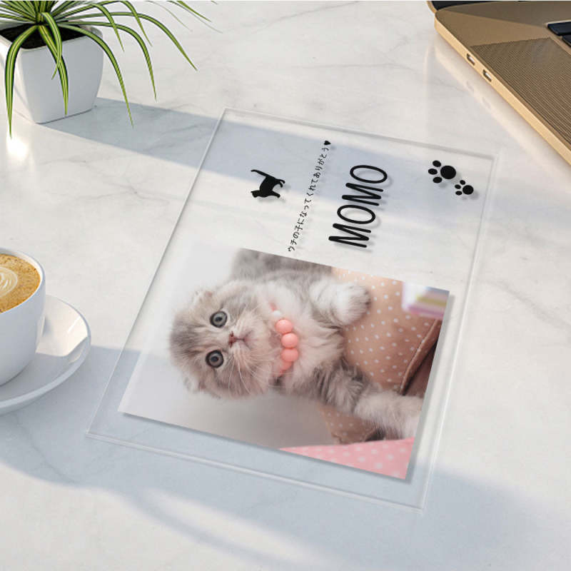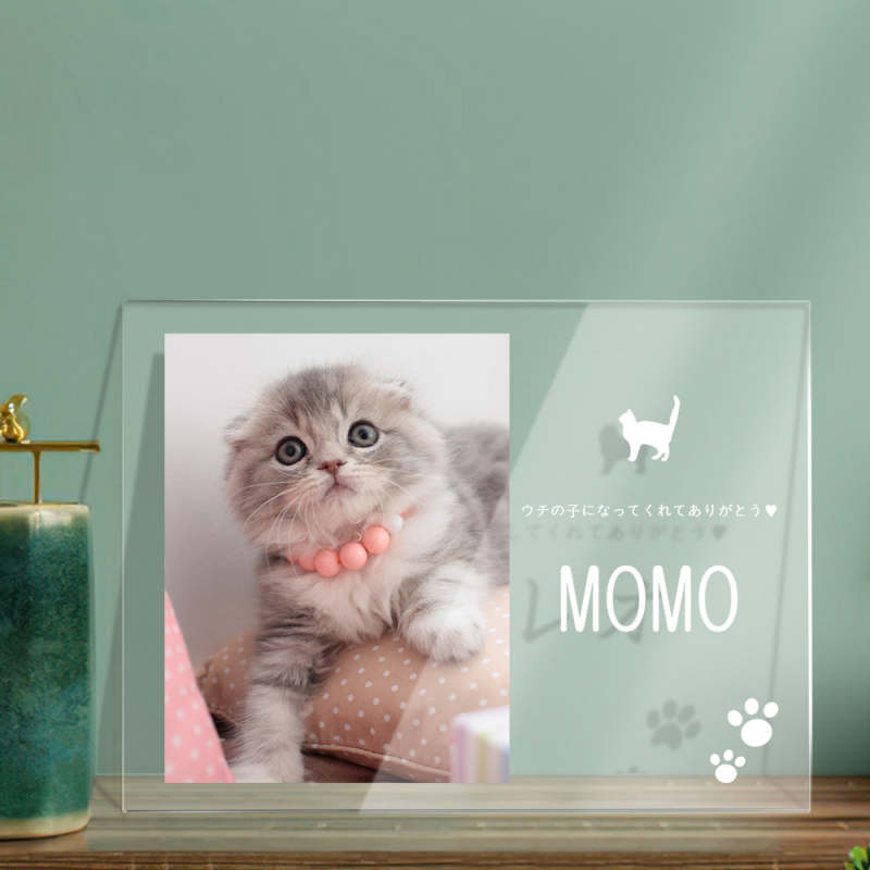 -お好きな写真と名前とメッセージをアップロードして、世界に一つだけのオリジナルフォトフレームアクリル製プラーク!このプラークはベッドサイドテーブル、机、オフィスなどのような水平面に自由に配置することができ、あなたのペットがいつもそばにいます。