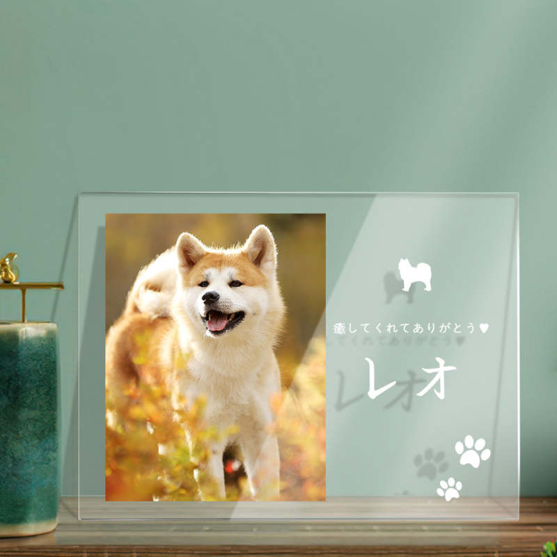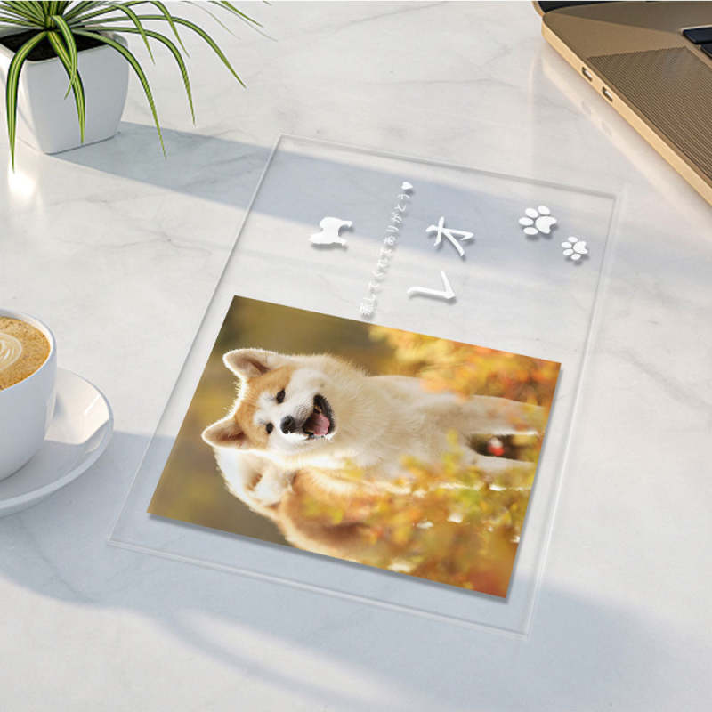 -お好きな写真と名前とメッセージをアップロードして、世界に一つだけのオリジナルフォトフレームアクリル製プラーク!このプラークはベッドサイドテーブル、机、オフィスなどのような水平面に自由に配置することができ、あなたのペットがいつもそばにいます。