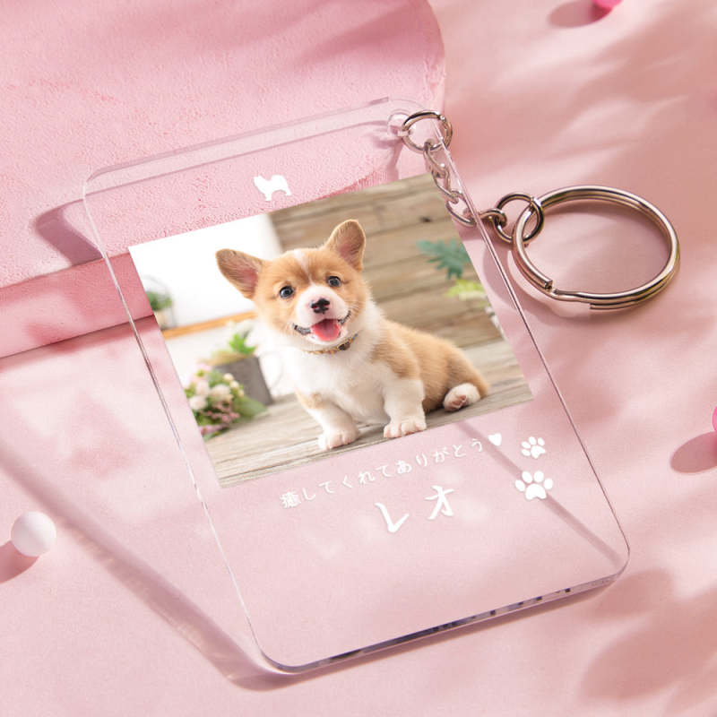 カスタムフォトアクリル製キーホルダー‐愛犬の写真と名前とメッセージ入れ可能なメモリーを込めったキーホルダー-肉球柄