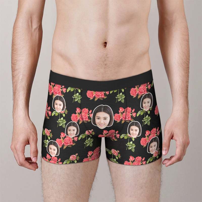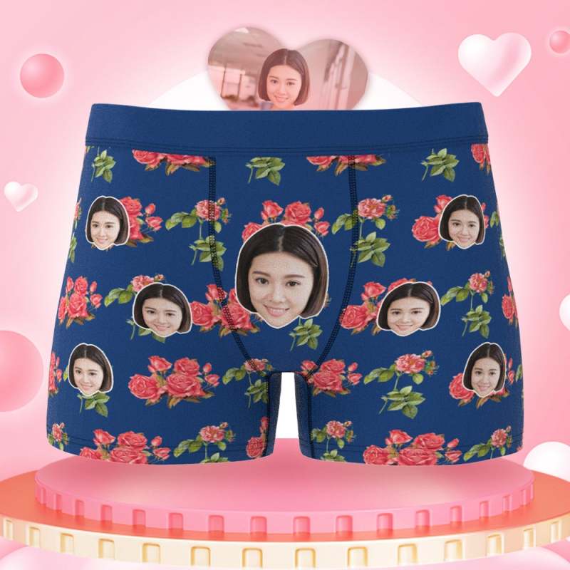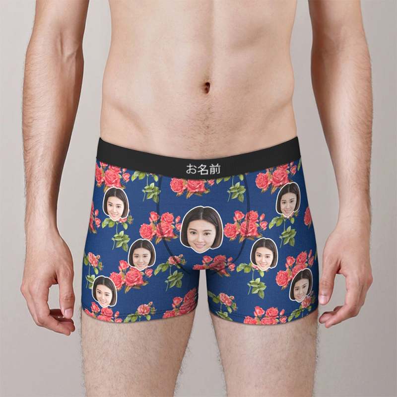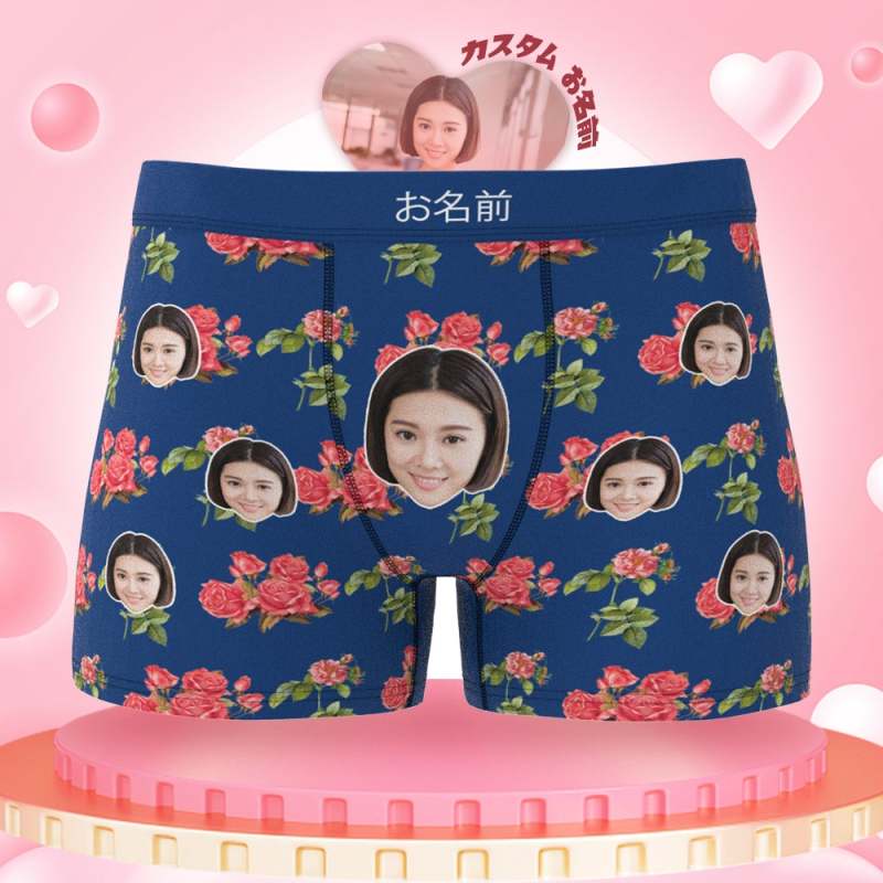 カスタムフォトボクサーパンツ-写真とテキスト入り可能な鮮やかなバラの花柄のオリジナル下着バレンタインプレゼント