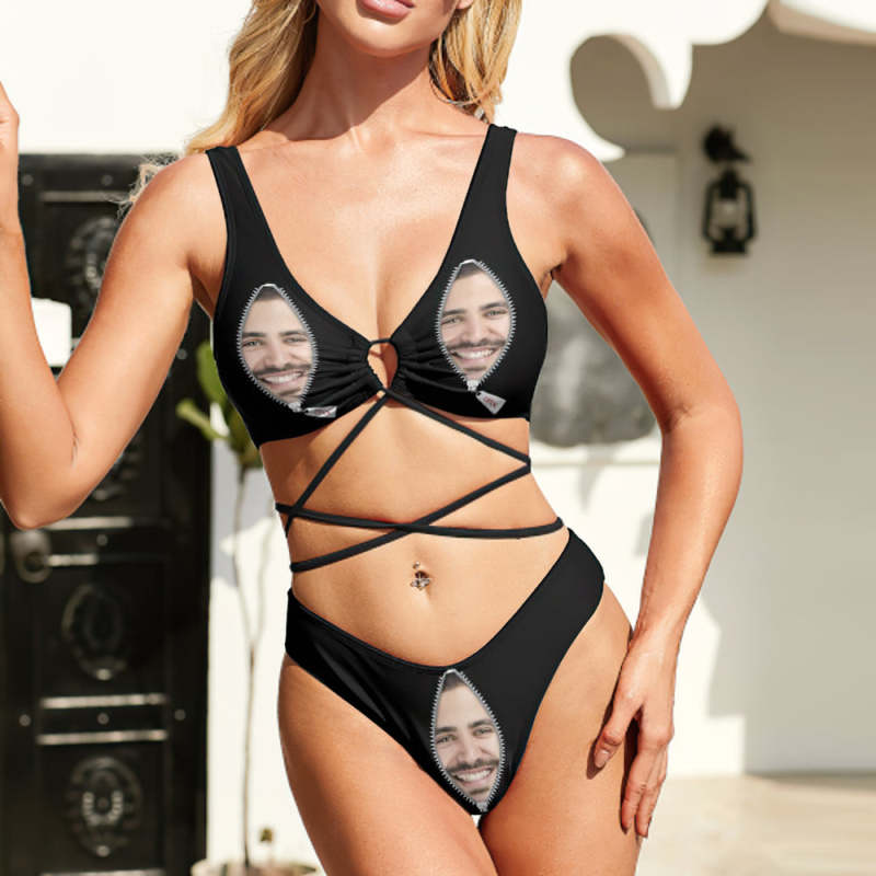 カスタムフェイスビキニ水着-女性式胸帯水着パーソナライズ写真ビキニハワイアンスタイルプレゼント - ジッパー