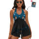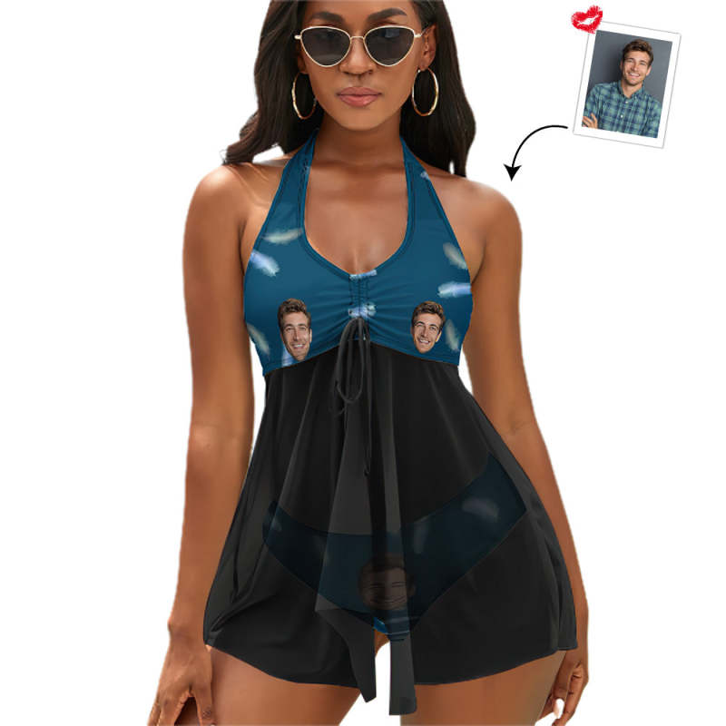 カスタムフェイス水着-写真入れ可能なレディース用はね柄のホルターネック体型カバー2点セット