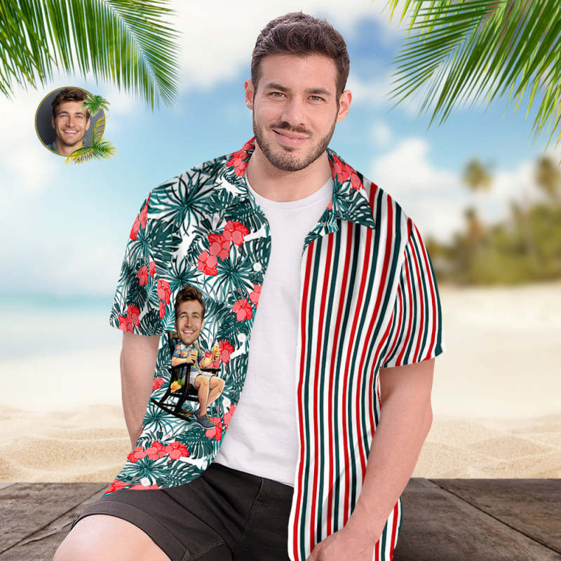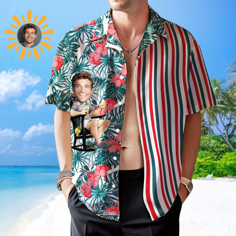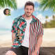 カスタムフォトアロハシャツ-写真入り可能なオリジナル縦縞アロハシャツ-赤い花 カスタムフォトアロハシャツ-写真入り可能なオリジナル縦縞アロハシャツ-赤い花