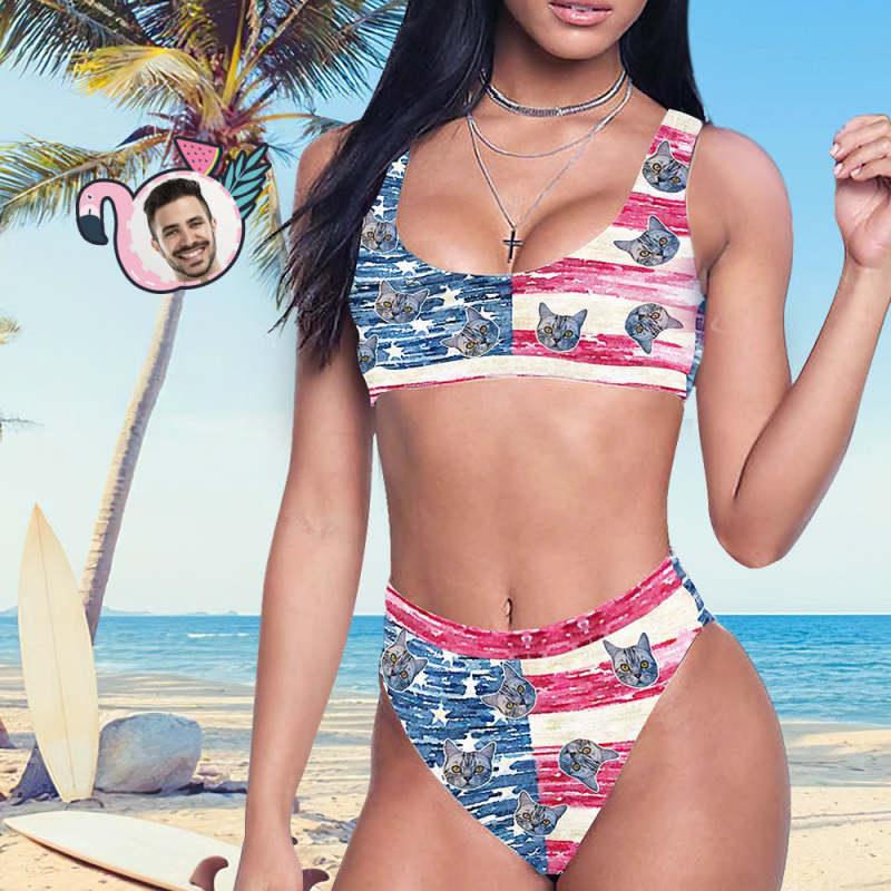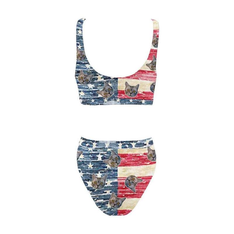 カスタムフェイス水着‐スポーツビキニ女性の写真ハイウエスト水着-アメリカの国旗