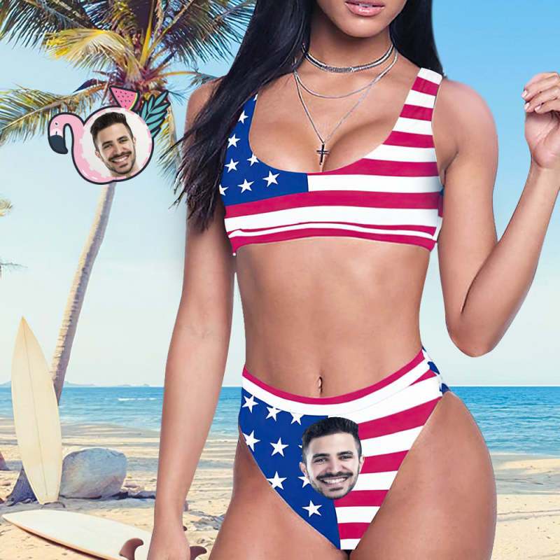 カスタムフェイス水着‐スポーツビキニ女性の写真入れ可能なハイウエスト水着-米国旗