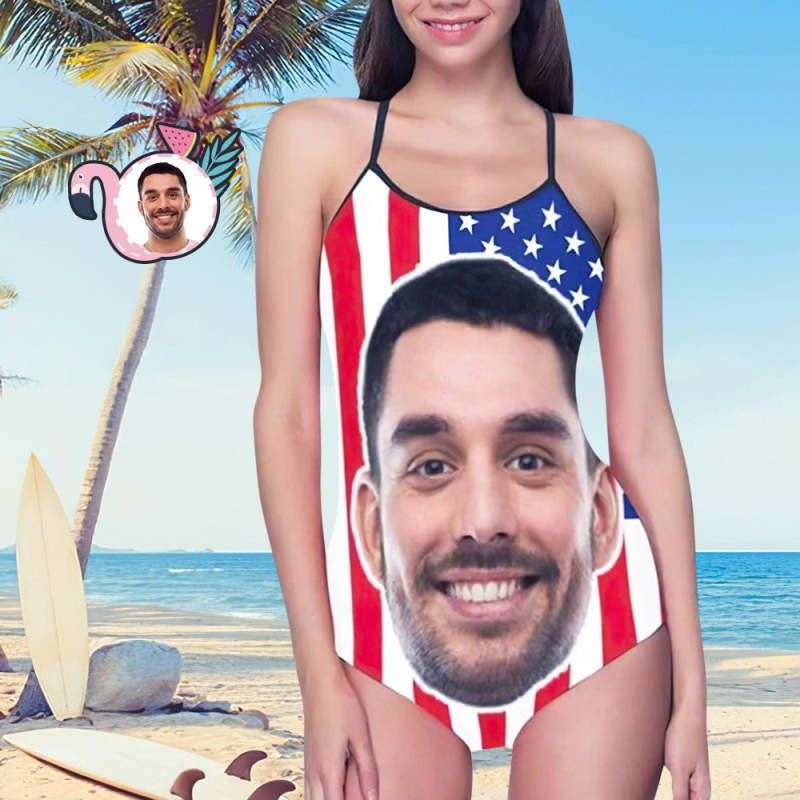 カスタムフェイス水着‐レディースフォトサスペンダーワンピース型水着-アメリカ国旗
