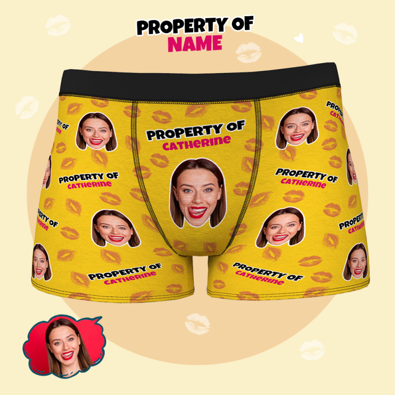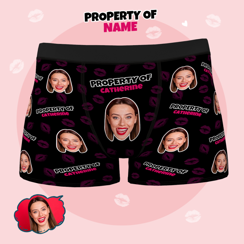 カスタム写真入り下着、赤い唇の模様がプリントされた、カップルへのユニークでセクシーなギフト。写真入りのパーソナライズされたバレンタインデー用下着。