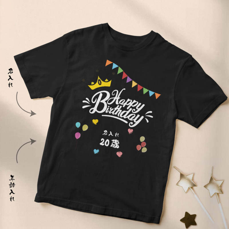 カスタム名前誕生日Tシャツ - 年齢や名入れ可能なオリジナルT-SHIRTプレゼント - 色とりどりの旗柄の誕生日プレゼント