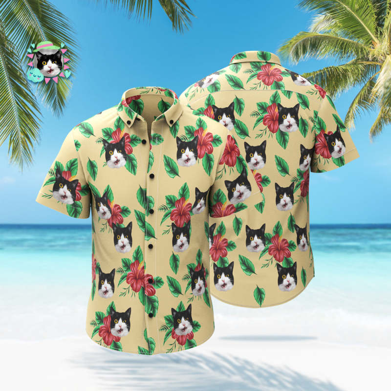 カスタムフォトアロハシャツ-写真入れ可能なオリジナルアロハシャツ-ネコとおしゃれな花柄 カスタムフォトアロハシャツ-写真入れ可能なオリジナルアロハシャツ-ネコとおしゃれな花柄