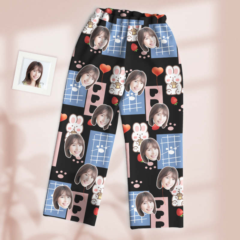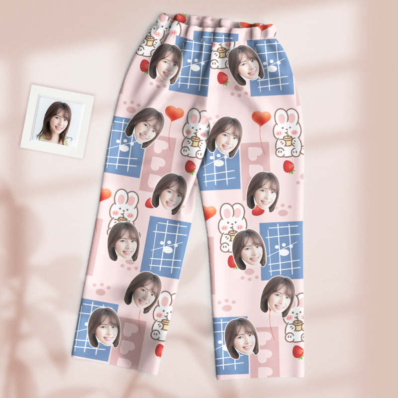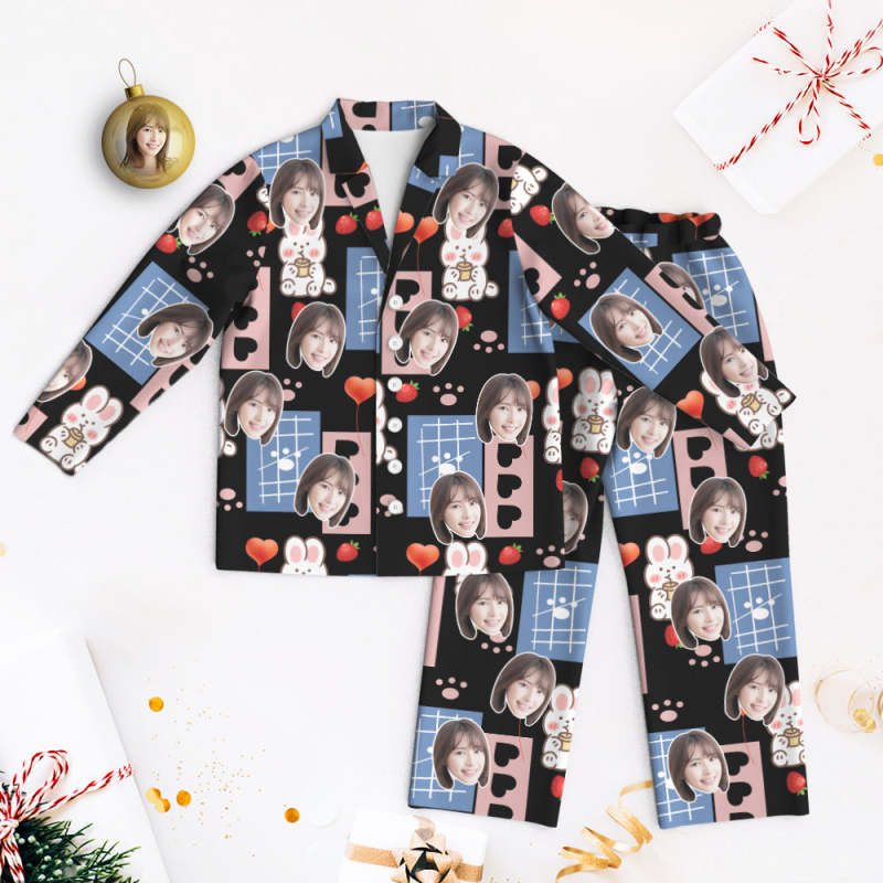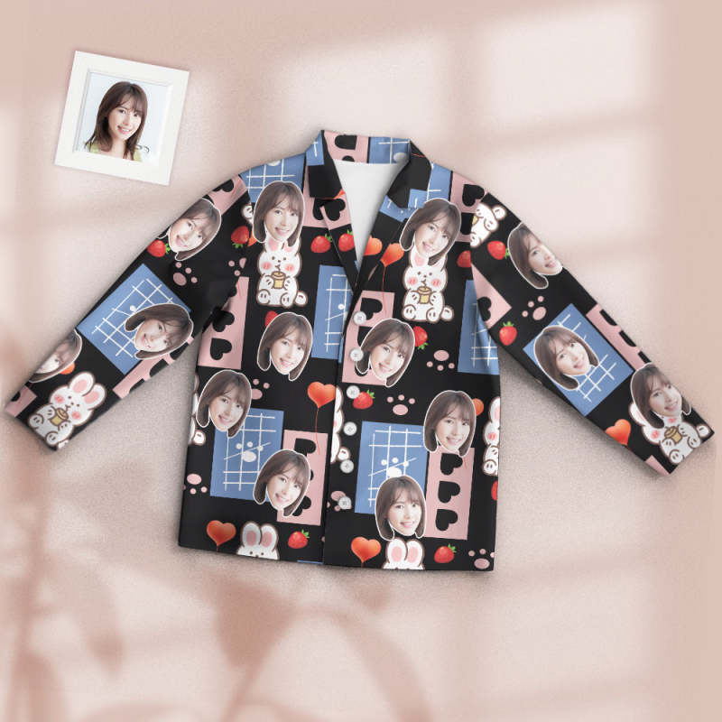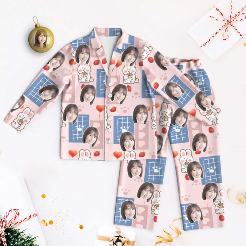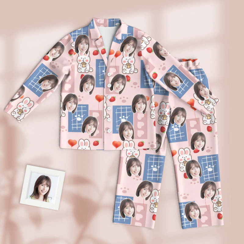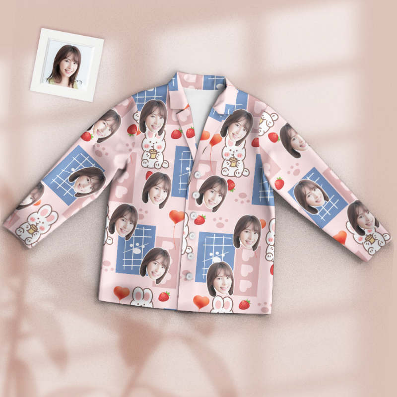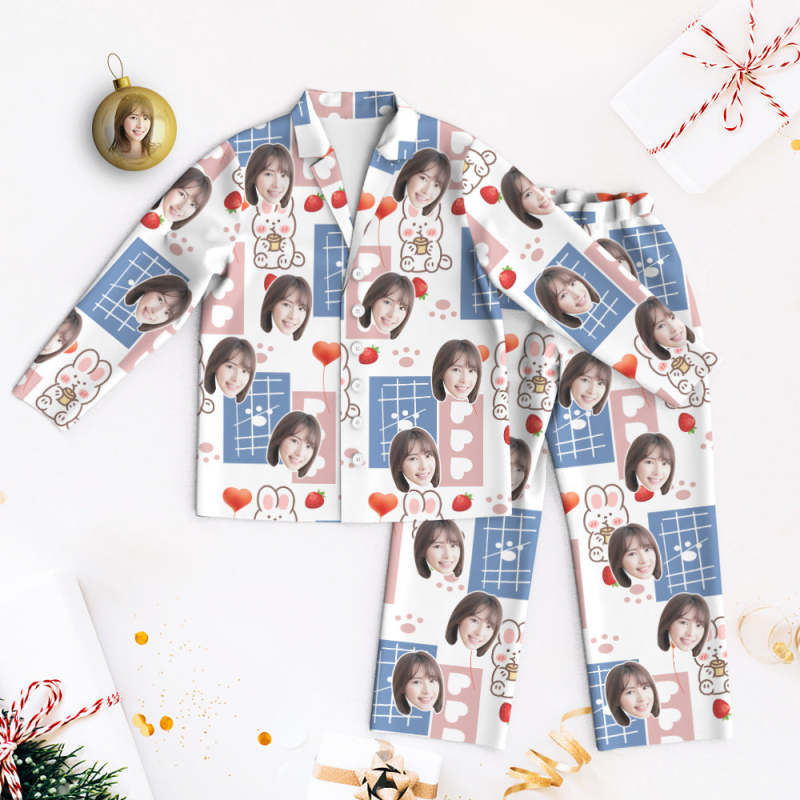 カスタムフォトパジャマ-写真入れ可能なオリジナル超可愛いイチゴうさぎ柄のパジャマプレゼント彼女への素敵なギフト