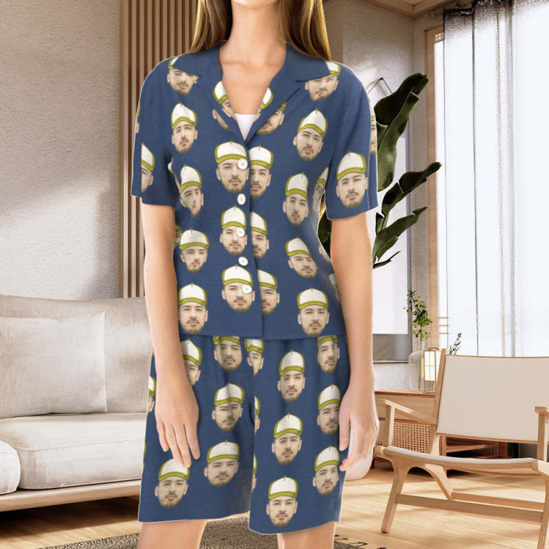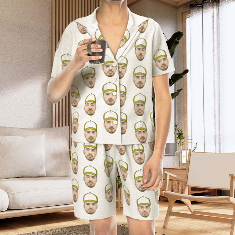 カスタムフォトパジャマ-写真入れ可能なオリジナル野球ハット柄半袖パジャマ-夏の涼しいパジャマギフト