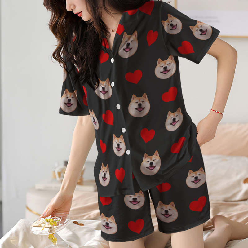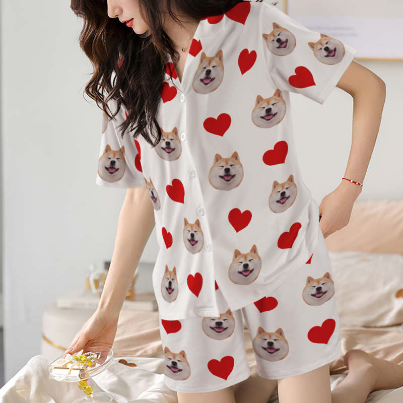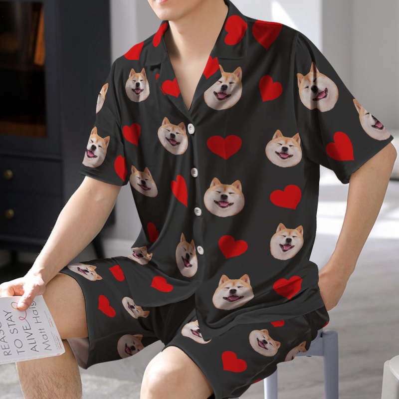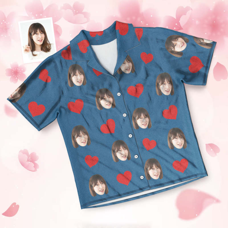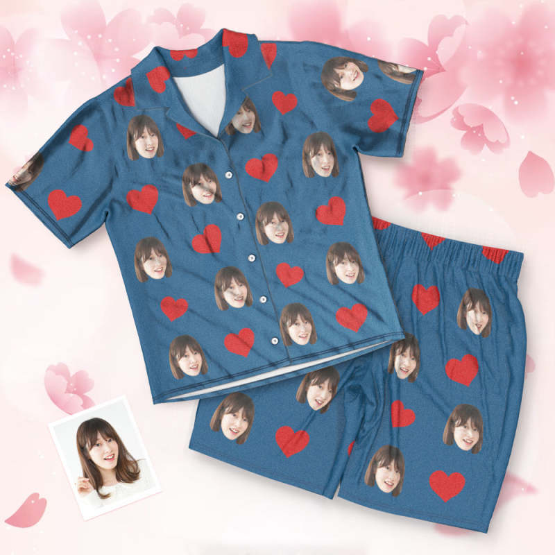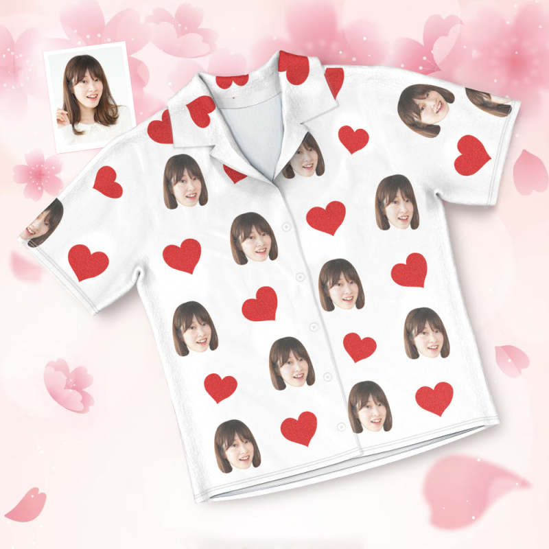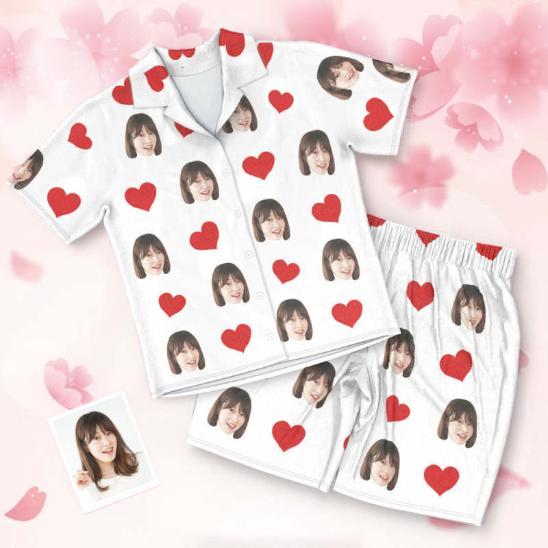 カスタムフォトパジャマ-写真入れ可能なオリジナル半袖上下セットパジャマ-ハート柄と背中の大きいサプライズ
