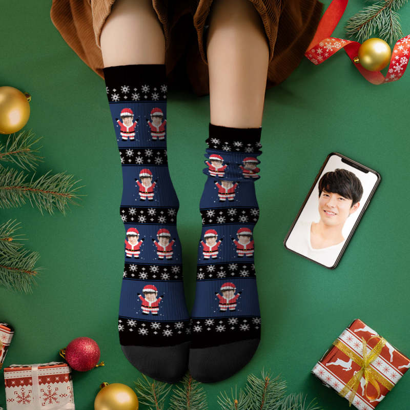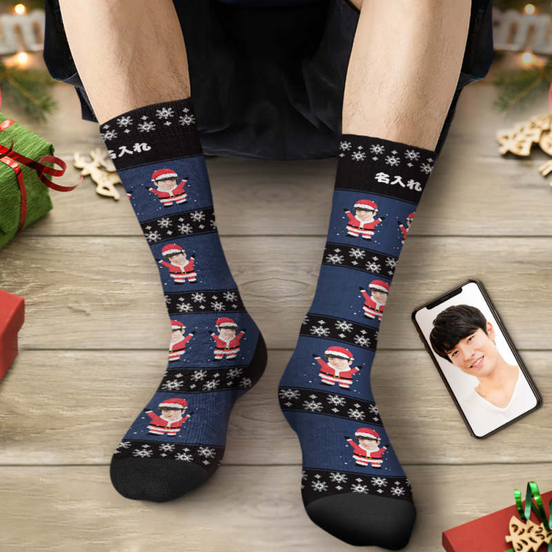 カスタムフェイスソックス-写真入れ名入れ可能なオリジナルクリスマス靴下プレゼント-雪花とサンタクロース柄