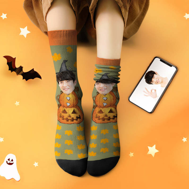 カスタムフェイスソックス-写真入れ名入れ可能なパンプキンマンと楓葉柄のハロウィンオリジナル靴下プレゼント