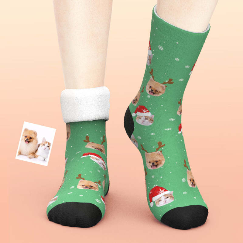 カスタム厚手フェイスソックス-ペット写真入れ名入れ可能なサンタ帽子と鹿の角柄のオリジナル秋冬用暖かいクリスマス靴下プレゼント